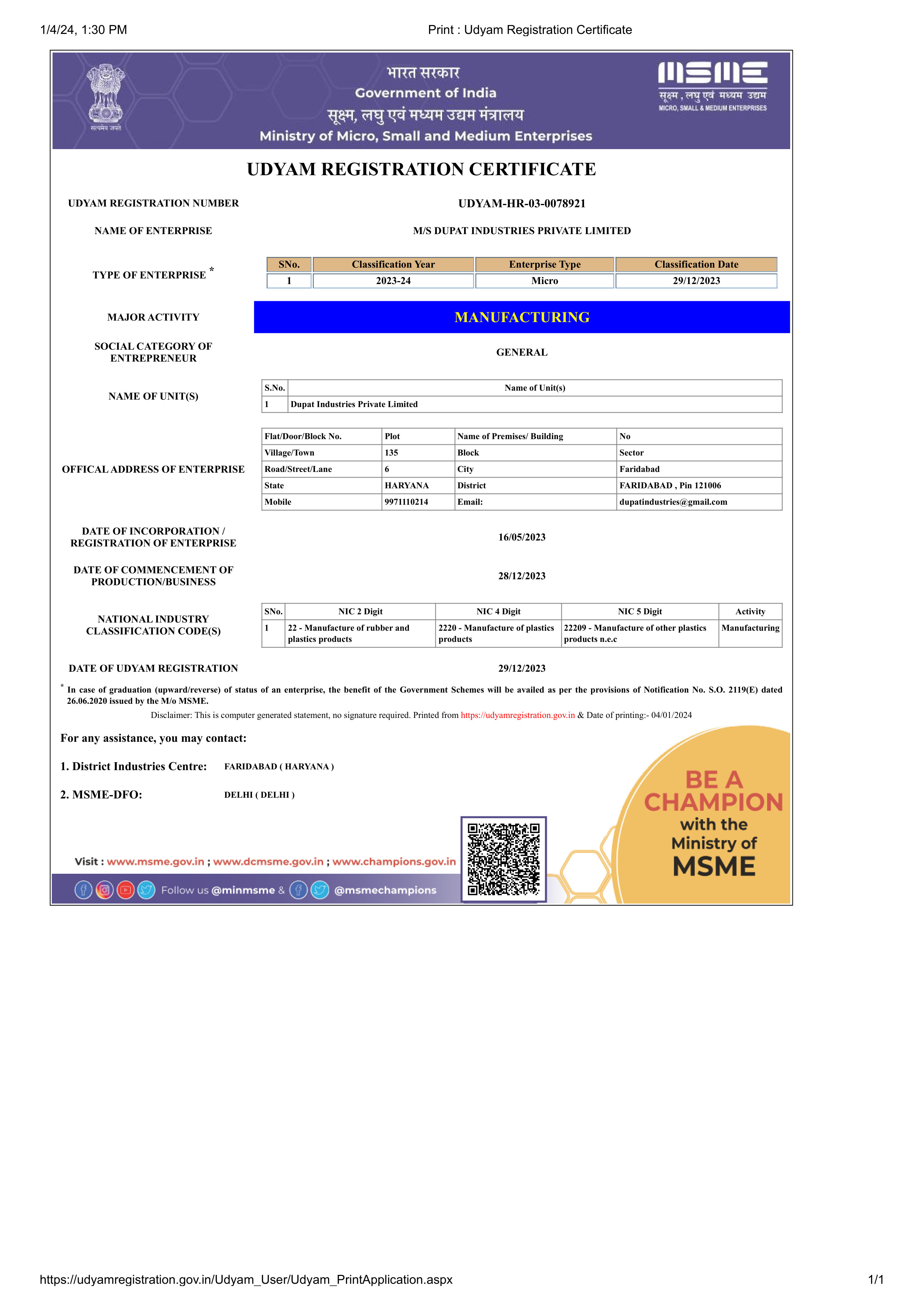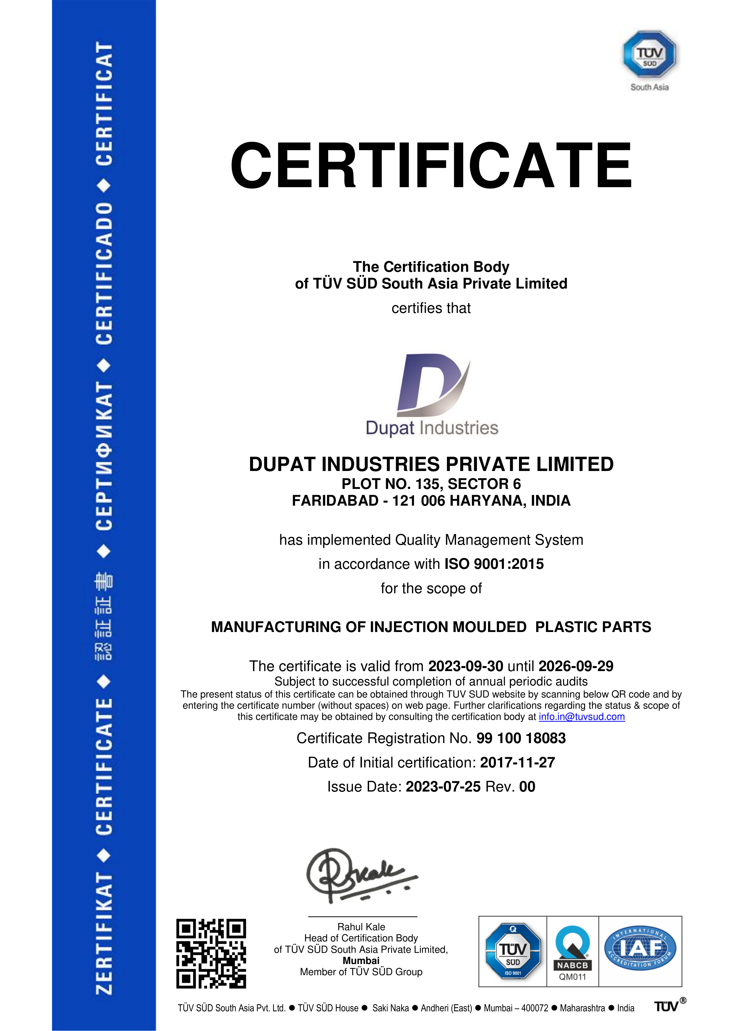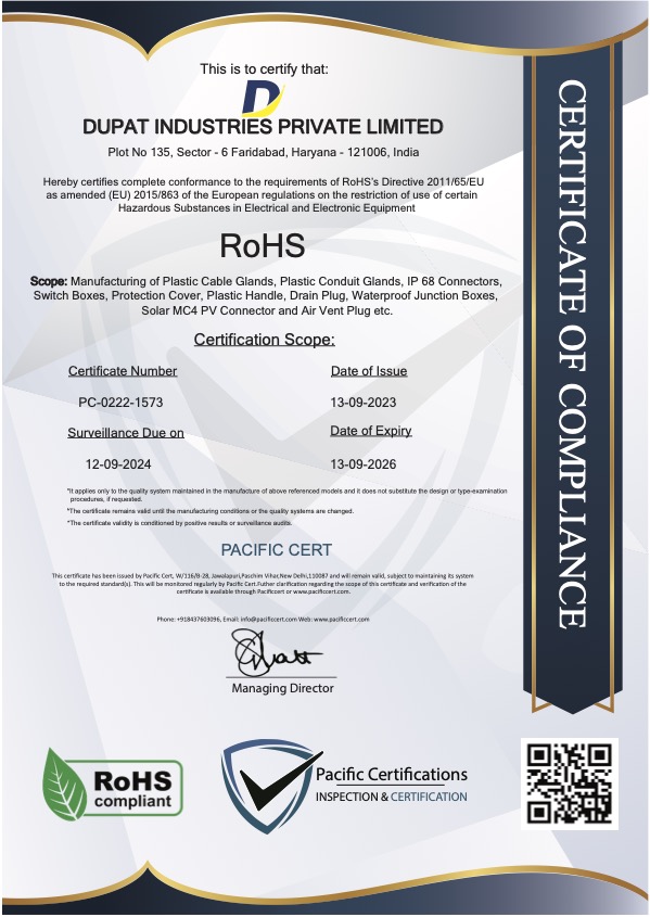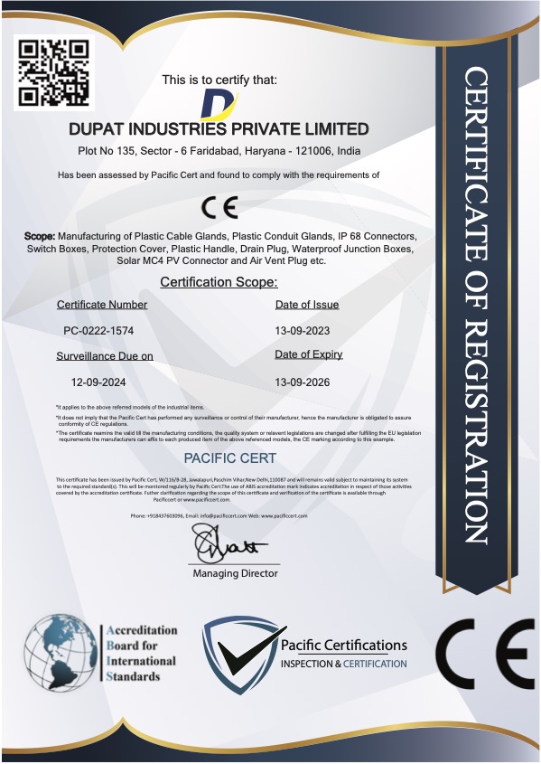 Dupat Industries Pvt Ltd, founded in 2017 by Tajinder Kharbanda, brings over 30 years of industry experience to the forefront. Specializing in manufacturing high-quality cable connection and protection solutions, DUPAT offers a comprehensive range of products including cable glands, conduit glands, LED parts, solar connectors, air vent plugs, wire connectors, gel connectors, waterproof junction boxes, and IP68 waterproof connectors. These products cater to companies in various sectors such as electric vehicles, solar panels, and lighting systems. Committed to excellence, Dupat Industries Pvt Ltd adheres to internationally recognized quality standards including ISO9001:2015, RoHS, and CE certifications. The company boasts a prestigious clientele including industry leaders such as Havells, Jaquar, Bajaj Electricals, and Crompton.